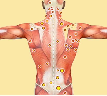 A triggerpontok olyan apró, borsószem vagy almamag nagyságú izomcsomók, amelyek nyomásra érzékenyek, és jellegzetesen kisugárzó fájdalmat okoznak a test más részein. A fájdalom gyökere és a tünet tehát gyakran két különböző helyen van.